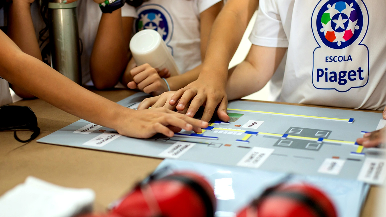 Mapa tátil da exposição Cidade Acessível. Duas mãos estão interagindo com o mapa.