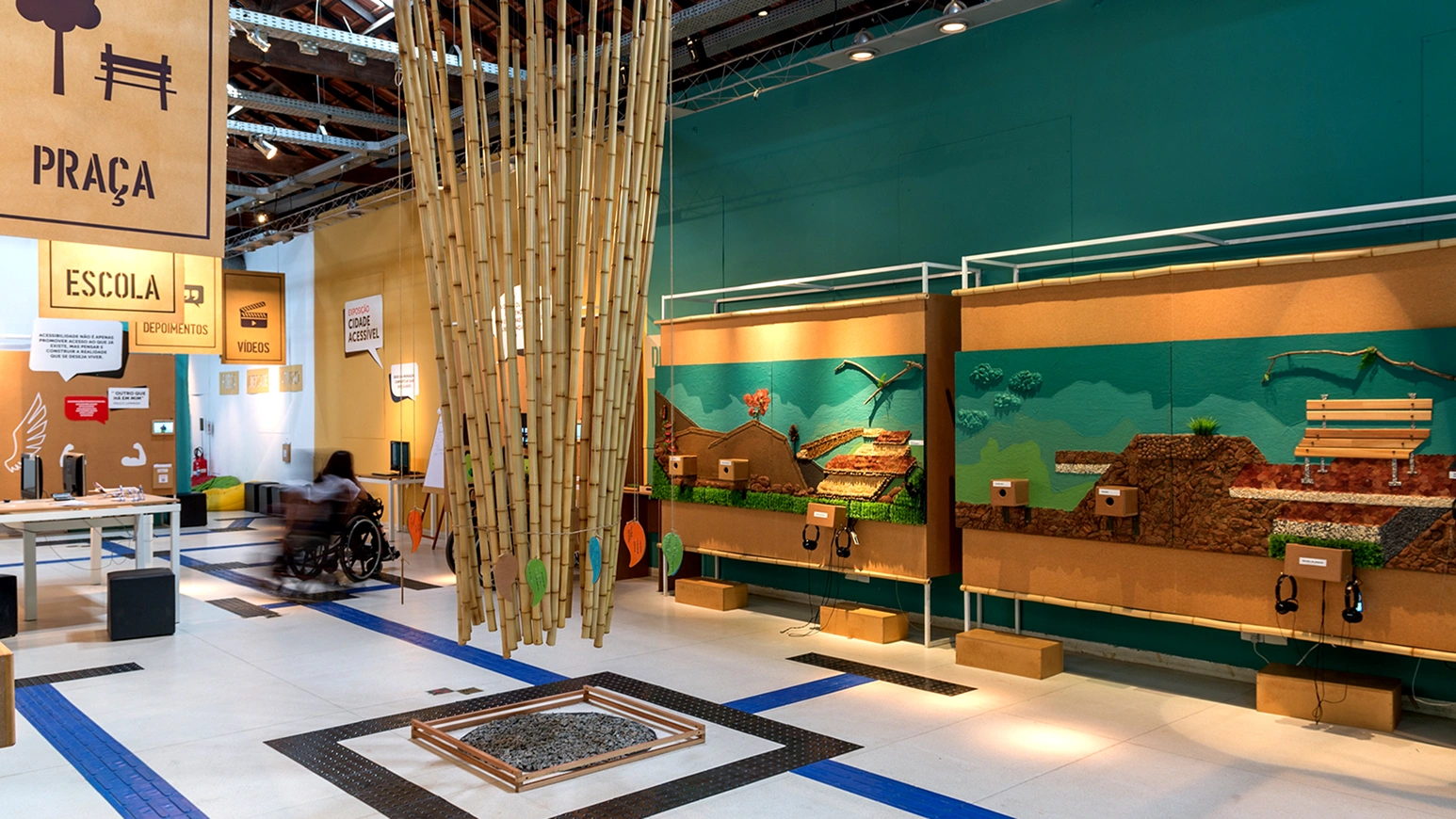 Exposição Cidade Acessível em espaço amplo. Placas de MDF suspensas e penduradas em suportes metálico no teto, fazem a sinalização do local, com nomes e icones. Ao redor do espaço, painéis alinhados às paredes e no centro um vão com percurso delimitado com piso tátil.