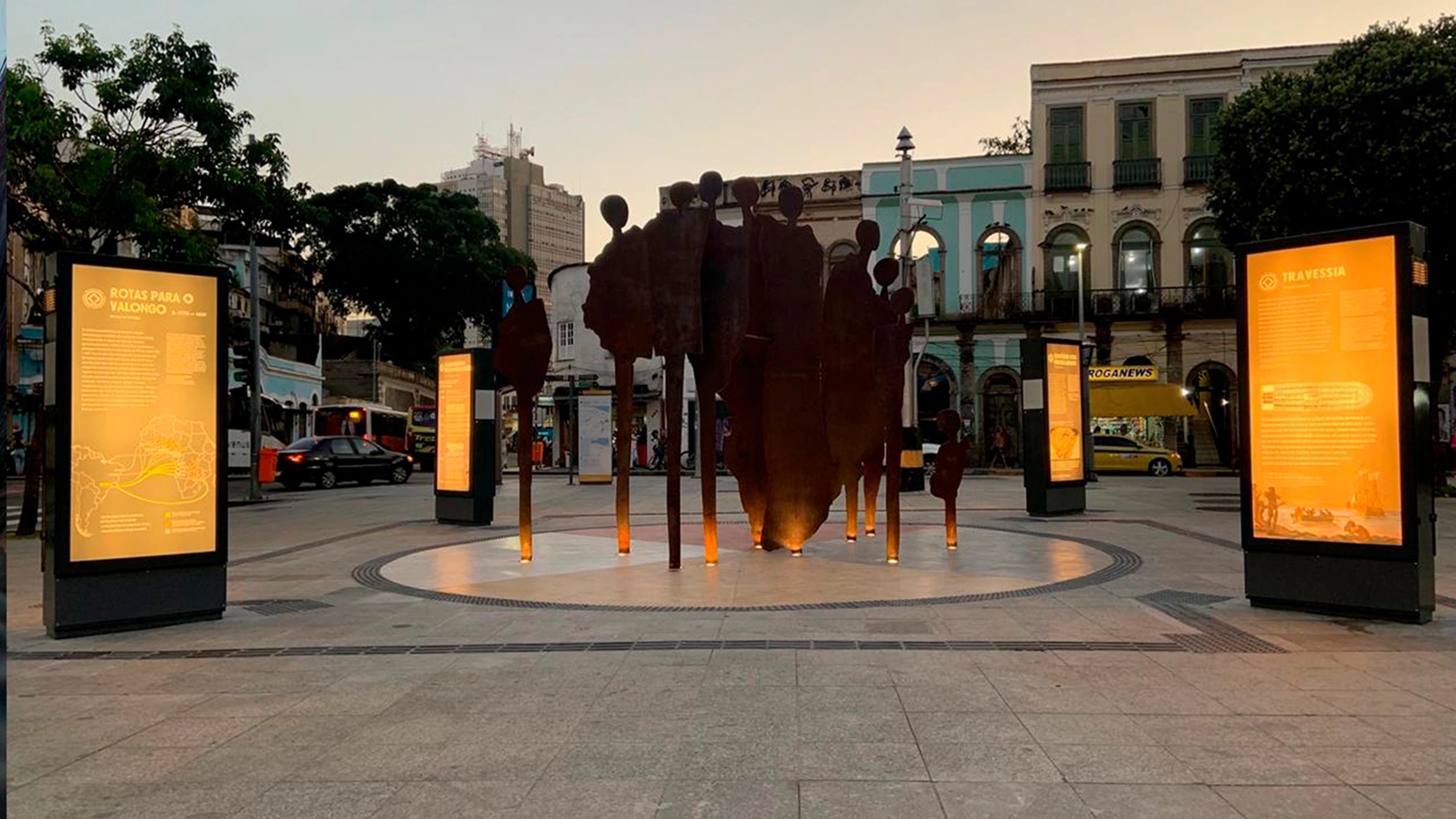 Grupo de pessoas conversando em volta de uma placa de mapa tátil. Atrás delas, uma grande porta de vidro com estrutura de metal preta.